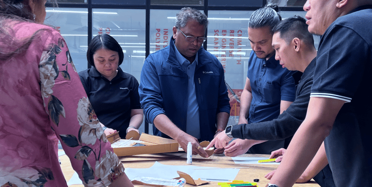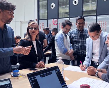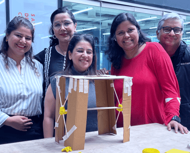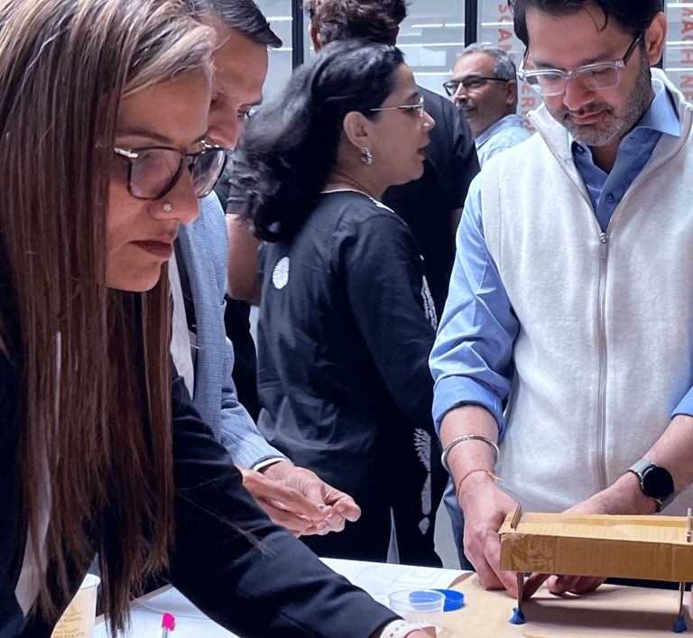 The workshop was delivered as a high-energy, hands-on learning experience using the design thinking framework adapted for executive learning. Participants worked in mixed-function teams through rapid ideation, model-making, and presentation exercises using simple materials to prototype solutions. The session emphasized human-centric problem framing, collaborative building, and quick testing cycles, resulting in multiple working prototypes and improved clarity in communication and decision-making. The experiential format encouraged leaders to “think with their hands,” fostering trust, engagement, and shared understanding across teams.